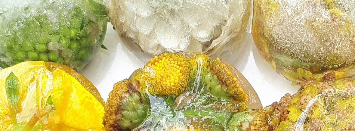 5. Once frozen you can pop out the flower ice cubes and admire your handiwork. Perhaps even take some photos or draw and paint the trapped flowers? Additionally, Some flowers create a very pretty stain, almost watercolour like once they start to defrost and you can use this to paint with.